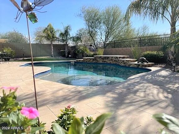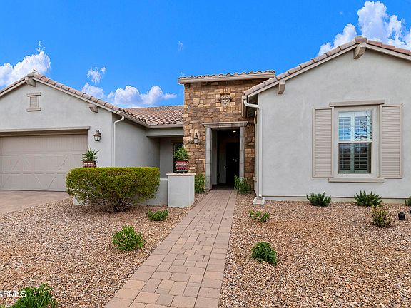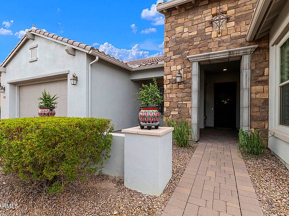 Resort style living & nestled between two lush greenbelts, insuring a tranquil & relaxing setting within the active adult community of Encore at Eastmark. Offering 2 spacious bdrms, 2.5 bths, a den & a flex/dining room. The open-concept floor plan showcases a stunning kitchen with stagger raised panel cabinets, lg island, SS KitchenAid appliances including a gas stove. Perfect for culinary enthusiasts & hosting gatherings. The multi-slider leads to the extended cover patio, travertine overlay & pebble tech pool w/Baja step & extended travertine surround & gas fire pit. Easy maintenance yard with turf accents. Garage is 38+ ft long. Encore has award winning facilities, club house w/workout facility, heated pool/spa, bocci ball, tennis & pickle ball courts. This home is a must see!