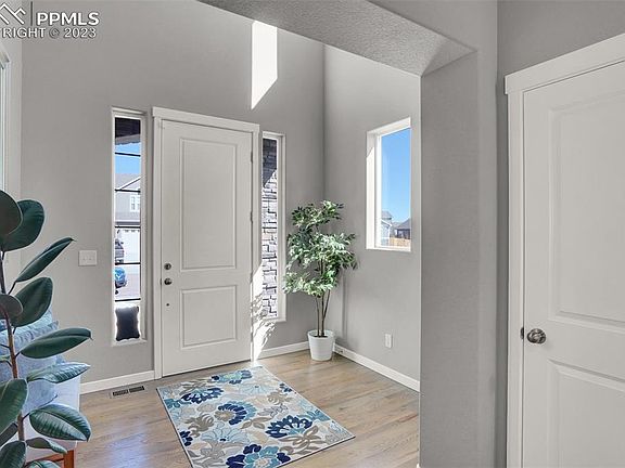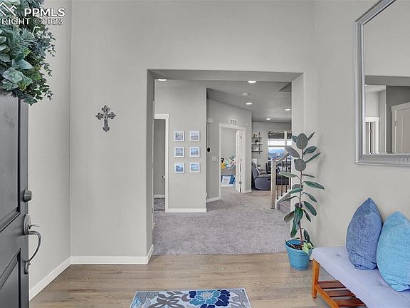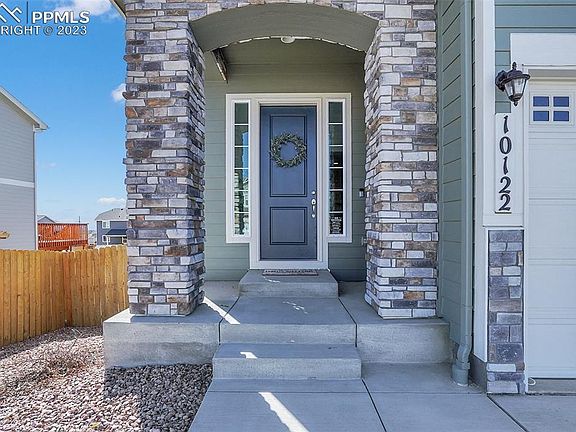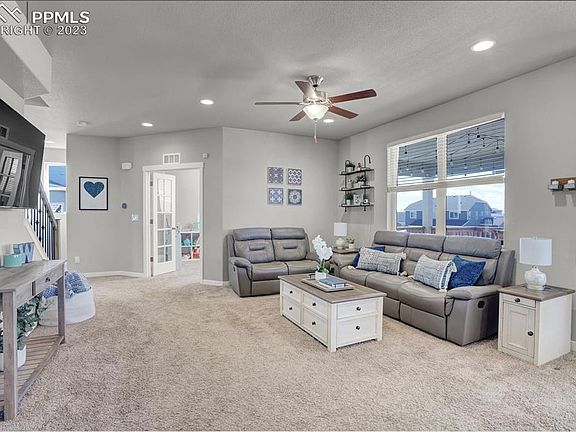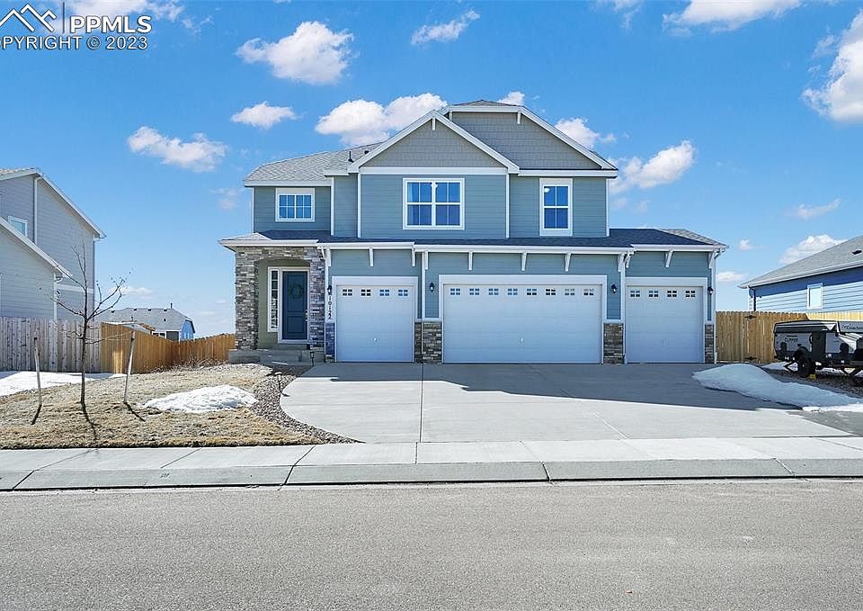 Looking for the home that has it all? This is the one! Two years new, 4 car attached garage, walkout basement, Pikes Peak and front range views from the covered deck, backyard, main and upper levels. Home sits on a quarter acre lot and no HOA dues! When you enter you are greeted by a large two story foyer that opens to a great room, kitchen and dining room. There is also an office space with French doors on the main level and views from every window. Sliding glass doors with custom built in dog door walk out to large, covered deck to enjoy the views. The four car garage is spacious and can handle cars and toys with ease. Upstairs you will find a large master retreat, 5 piece bath with soaking tub with mountain and Pikes Peak views. Three more large bedrooms, a loft and a full bath also on the upper level. The walkout basement is waiting for your finishing touches and is already roughed in for a bathroom. Basement walks out to a patio and large, fenced backyard.