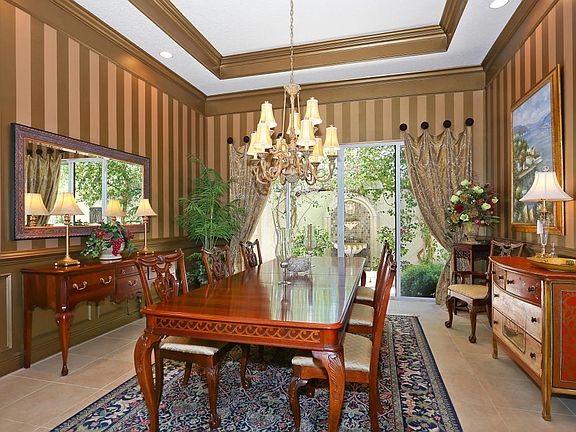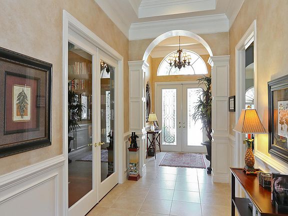 This is a one of a kind home w/many custom upgrades.Double lead glass entry doors, double coffered ceilings, max. crown molding,wainscoating & custom arches. Floors are ceramic tile in kit., large formal DR, and large great room. This home has the ultimate custom shelves, cabinets, and built-ins. Gourmet kitchen w/gas cooktop,granite counters, tumbled marble backsplash, island w/veg sink & disposal. Wine rack, pantry pull-outs. Library w/custom shelves & built-ins, wood floors,double glass doors w/touch lights. Master suite w/his&her baths, whirlpool tub & bidet. Powder bath has Venetian plaster & designer tile. 2 guest suites w/baths. Covered patio w/ summer kitchen. Pool has a great private water view, w/sheer descent waterfall. Paver brick motor court. Side entry 2.5 garage with