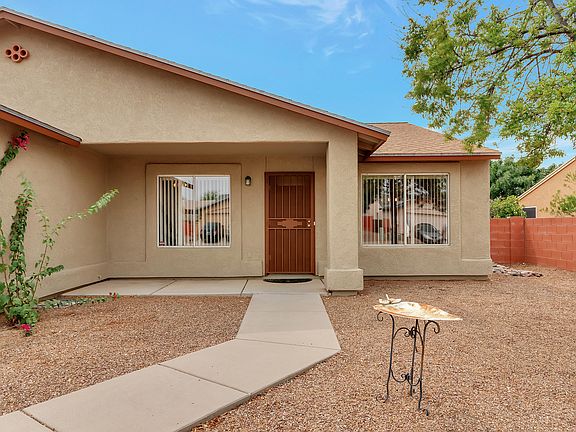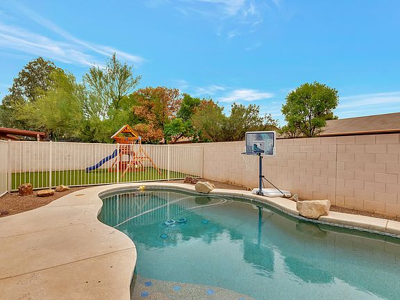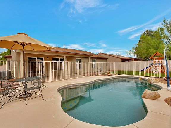 Desirable Rita Ranch home for sale with a pool! A highly sought after floor plan with split bedroom suite. Roomy master with full bath and walk in closet. Bath features separate shower and soaking tub. Kitchen opens to family room with high ceilings. Place for bar stools and eat-in kitchen nook with bay window. Handsome ledge for decorations above cabinets. Clean, sharp, ready to move in to. Windows washed, carpets cleaned, ready to go. 3 bedrooms plus den. Pool is fenced for security, covered patio and separate play yard. Jungle gym is included. Exterior freshly painted and new roof. North/South orientation. Show with confidence.
