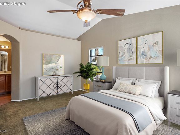 Experience the cozy charm of this beautifully maintained single-story Summerlin gem, perfectly nestled in a tranquil cul-de-sac. This 3-bedroom, 2-bath home combines a prime location with exceptional quality, featuring elegant two-tone paint, soaring vaulted ceilings, and a warm fireplace in the family room. The home also offers a spacious front living room and a gourmet kitchen equipped with sleek stainless steel appliances, a central island, and an inviting eat-in nook area, all complemented by abundant cabinet storage. The primary suite includes a large walk-in closet, a luxurious bath with a separate shower and garden tub, and direct access to a stamped concrete back patio. The charming front porch, set to the right of the entrance, adds to the home’s inviting curb appeal. With an extended 22 ft deep 2-car garage and professional decor and landscaping, this move-in-ready residence reflects true pride of ownership, making it a rare and delightful find in the heart of Summerlin.