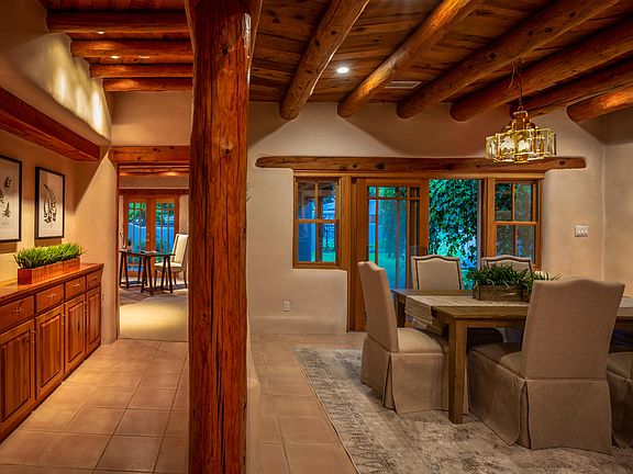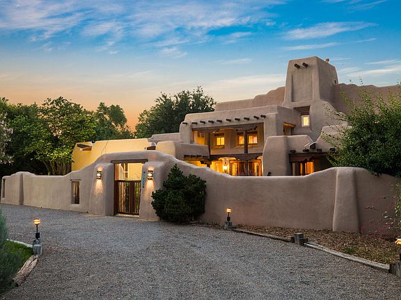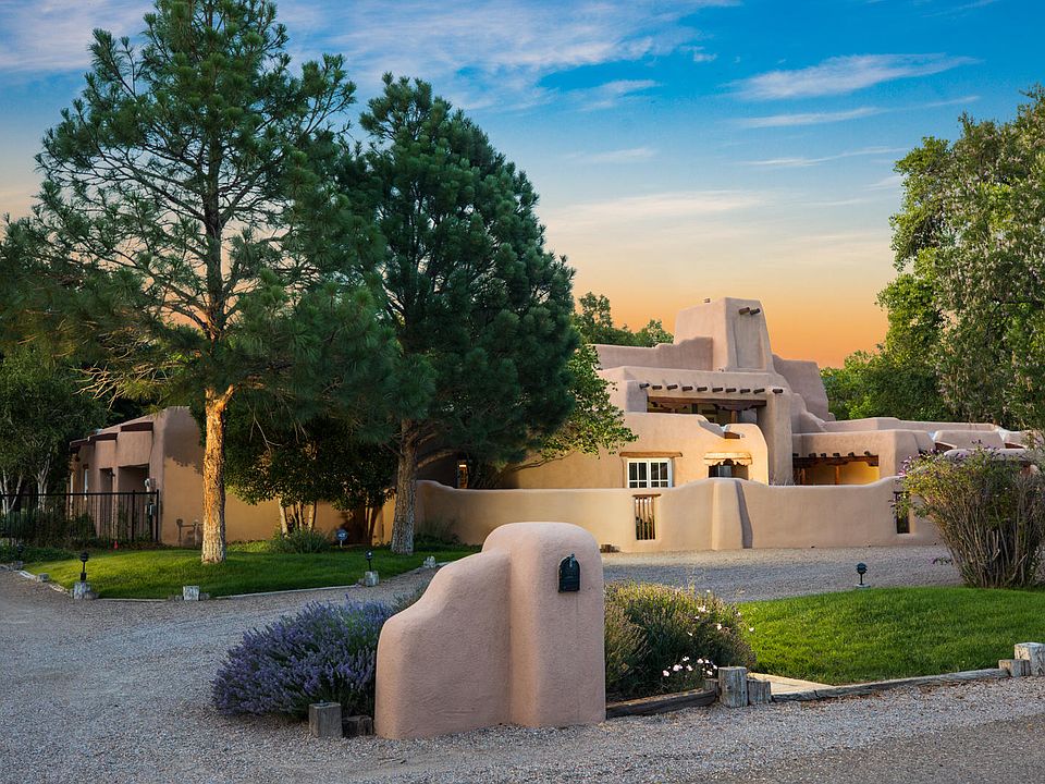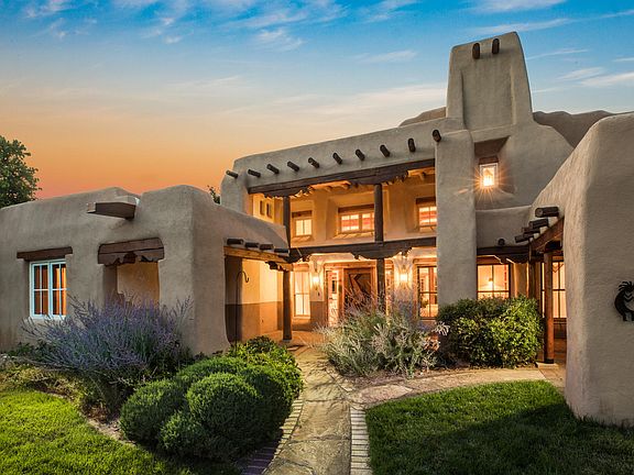 Enchanting hand crafted Adobe home built by Albert Parra, one of the leading experts in adobe construction. This incredible home is nestled in a beautiful North Valley neighborhood with close proximity to the Bosque trail system. The property is a verdant oasis lushly planted with beautiful trees, grass and mature landscaping. There are horse facilities including a barn and large field. The home is classic New Mexico and features thick adobe walls with hand troweled plaster, beautiful varying beamed ceilings throughout, hand carved corbels, and handcrafted doors and cabinetry. Beautiful deep portals shield the home from the sun, and classic kiva fireplaces add ambiance all year. This exceptional home is truly a work of art nestled in a private and peaceful setting.