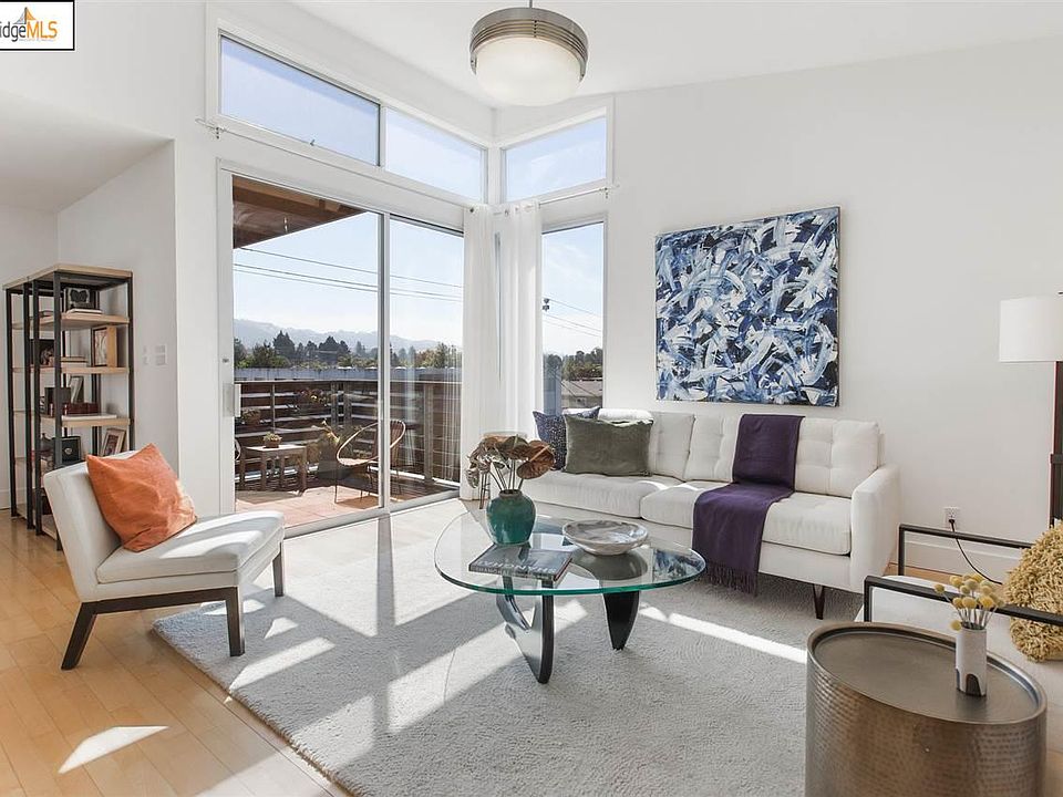 Built in 2005 this Euro style, two storey, contemporary townhome in Albany is a rare find. With dramatic ceilings, an open floor plan, abundant light, and two decks this home is ideal for the entertainer and allows for the best of indoor/outdoor CA living. Both sunny bedroom suites are on the lower level allowing for excellent separation between public and private spaces. The upper level is bright and open with easy flow from the outdoors to the dining area and open plan kitchen. The soaring ceilings and large windows in the living room make for an inviting space. The large den makes working from home easy. The rear deck is large enough to host a dinner party and the front deck has captivating views of the Berkeley Hills. The welcoming entry has a water feature, sumptuous wood paneling and the architecturally interesting stairwell leads to the unit. There is garage parking for two cars and storage. Minutes to Solano Ave, freeways, schools, transbay bus, shops and restaurant.