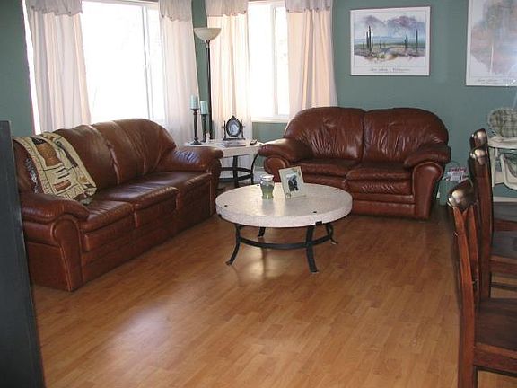 SUCH A SWEET SURPRISE! The inside of this newer home has been BEAUTIFULLY REMODELED in 2003 with all new paint, quality carpet, laminate & custom tile. New stainless steel appliances in the open kitchen to living & dining area. Private fenced backyard with deck, paved driveway, tiled arctic entry, closet organizers. Curtains in living room & dining area do no stay. You MUST get inside to see this