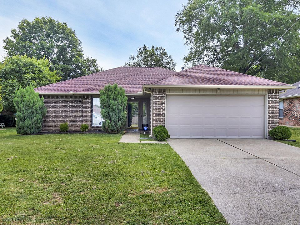 Location! Enjoy the perks of living 20 minutes from Downtown with convenient interstate access for commuting. This all brick home offers one level living with an oversized living room with vaulted ceilings and a fireplace for entertaining family and friends. The primary bedroom is located on a separate wing of the home with a large walk-in closet. On the other side of the home you'll find 2 guest bedrooms and a large hall bath. This home offers a dining space off of the living room and a kitchen w/pantry. Brand New Gutters and Roof! Great backyard that can be fenced. Wired for an electric vehicle in the garage too! 1/2 mile from Dodson Elementary School. Priced to sell and you can't beat the space/location.