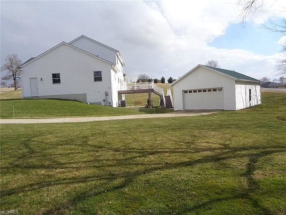 Spacious two story with open concept. 4 bedroom - 2 ½ bath home situated on .762 of an acre. Large kitchen with tile floor, granite countertops and newer appliances. (dishwasher purchased in 2018, microwave 2016 and range 2014.) Open family room with gas log, stone fireplace. Bamboo hardwood floor in the dining room and foyer. 1st floor laundry room/mudroom. Large Master suite with bath plus 3 additional BD (2 have been freshly painted) and Guest bath on 2nd floor. Semi finished and freshly painted walk-out lower level with French doors and rough in plumbing for additional bath adds an additional 1,240 sq ft to the home to the 2,340 sq ft on the top two floors. 9'ceilings. Pella windows throughout. $26,000 oversized 16' x 26' two tier Trex deck off the kitchen. 2 car attached garage plus 6 Car detached 26' x 40' garage. Newer water softener in December 2017. Newer hot water heater. Generator hook up for the house. Clean and neat, shows well. Garaway Schools. A lot of square footage for the money, with no deed restrictions and city utilities. Could not replace this home with all the extra amenities for the money.