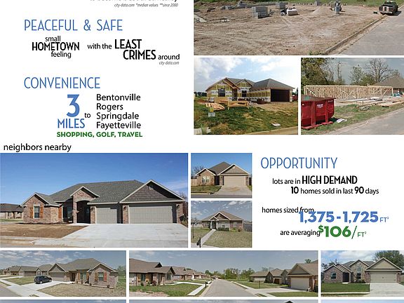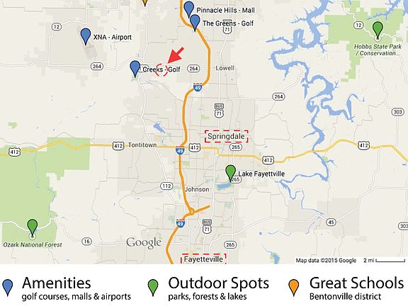 Small hometown with the least crimes around. Within 3 miles of Bentonville, Rogers, Springdale and Fayetteville, you have golfing, malls and a beautiful airport with several outdoor recreations just a little further. You are located inside the coveted Bentonville school district - each school within the system rated 9 - 10.