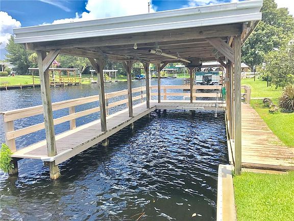 Canal Frontage to the Chain of Lakes. Very well maintained home with tons of storage! Canal frontage with covered boat dock, boat lift, seawall, very nice wide canal. Well maintained home featuring a living room and a family room, and a very large florida room overlooking the canal. Nice size kitchen with an island open to the living room and easy access to fthe formal dining room. This home has plenty of room for entertaining. New roof in 2017, 2 car garage and a 2 car carport, 2 driveways for extra parking. An additional storage rooms perfect for a workshop plus an additional laundry room, over 3,000 sq ft total square footage. Very nice community with low hoa fee of $25/month which allows use and maintenance of the common areas. There is a community pool and community recreational center and community boat ramp. Ideal location in Tavares very close to hospitals, shopping, and restaurants. Located minutes from Downtown Tavares the Seaplane City!