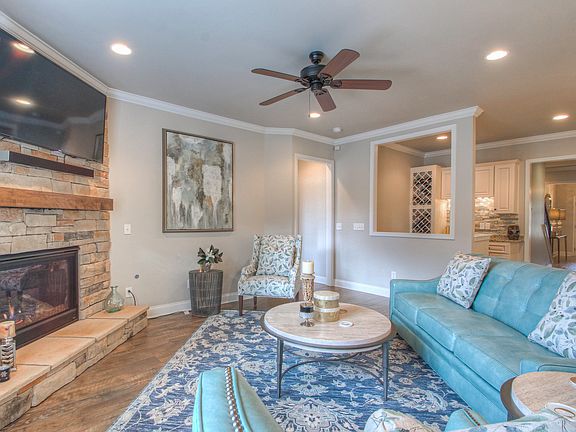 Are you ready for one level living at its finest? This beautifully decorated corner lot ranch boasts a bonus room, bed and full bath up while the primary and additional bedrooms are down stairs. Enjoy entertaining or having your coffee/tea times on the lovely screened patio at the back of the home. A custom feature you are sure to enjoy is the wine rack, beverage fridge and prep area located in the planning room just off the kitchen. Be sure to see the special touches like the stone backsplash in the wine/butlers area and on the outside of the kitchen island. Cozy up and enjoy the wonderful gas log fireplace in the living room adorned with stacked stone and a cedar beam mantle.
