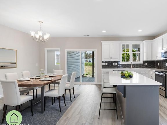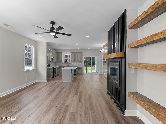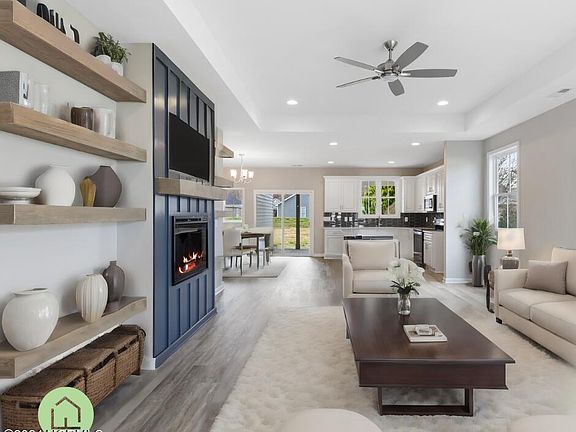 Cute as a Button Ranch Home w/Rocking Chair Front Porch! Backs to Wooded Open Space! Upgraded LVP Flooring Throughout Main Living Areas! Matte Black Lighting Package! Kitchen features Locally Made & Custom Painted Cabinets w/Matte Black Pulls, Quartz Countertops, Tile Backsplash, Center Island w/Breakfast Bar, Sink w/Window Above, Walk In Pantry! Open to Dining/Breakfast Area w/Sliding Door to Covered Porch! Owner's Suite features Tray Ceiling w/Crown, Double Window & Plush carpet! Owner's Bath w/LVP Flooring, Walk In Shower w/Tile Surround, Double Vanity & Water Closet! Family Room w/Tray Ceiling w/Crown, Luxury Vinyl Flooring, Custom Trim Surround Fireplace w/Accent Color & Floating Display Shelving! Open to Dining/Breakfast & Kitchen Area!