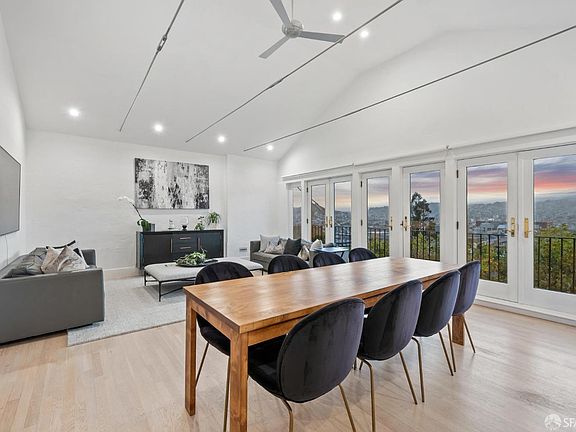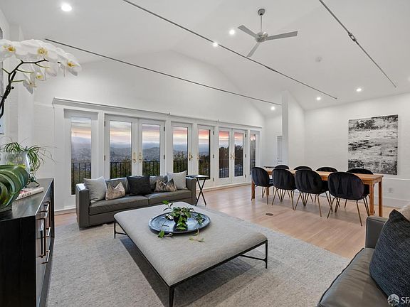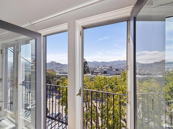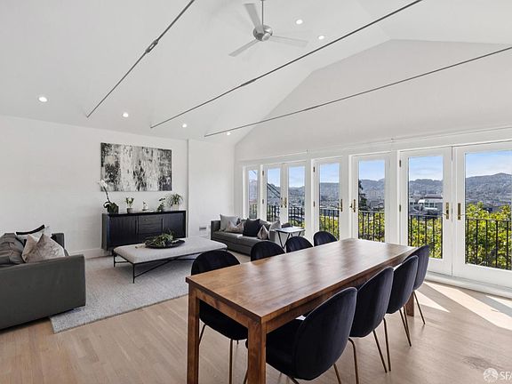 Captivating Potrero Hill retreat with sweeping city views and enchanting outdoor space! Behind its cheerful blue faade, a dramatic living room presents soaring ceilings, bamboo floors, exposed beams, and a wall of French doors framing views west across the city. The open dining/living area flows to the chef's kitchen, equipped with a polished concrete island, butcher block counters, Viking range, custom cabinetry, and built-in dining banquette. French doors open directly to a lush 3-tiered garden with a lemon tree and koi pond. The magical garden is an entertainer's dream with a dining patio with built-in heaters, and string lights overhead. The main level hosts a guest suite with Murphy bed, French doors to the garden patio, and an ensuite bath with shower. The lower-level primary suite features a spacious bedroom oriented toward the views, a large walk-in closet, and a luxurious ensuite bath with double sinks and a walk-in shower. Completing this level is a laundry room and a sunroom with a glass door that opens to the garden, an ideal office/gym/nursery. 1-car garage plus front parking. Perched on the western slope of Potrero Hill, this location offers plenty of lovely green spaces nearby, plus shops and restaurants on 18th St. and 24th St.