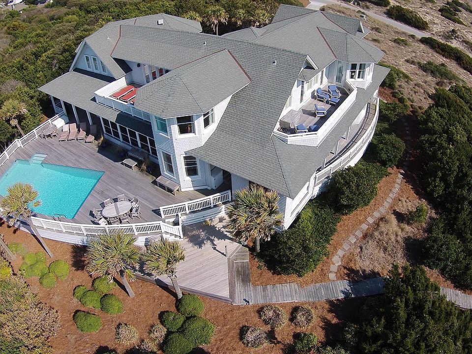 This six-bedroom home on the High Dunes provides panoramas of the Atlantic from a variety of gathering spaces-including a great room, two media rooms, an office, the pool table room and several reading nooks. The gourmet kitchen, equipped with a Sub-Zero refrigerator, Viking Professional range/oven/bun warmer and dual Kitchen Aid Superba dishwashers, overlooks the pool and accommodates several chefs. Savor your meals in one of the four dining areas-the indoor dining room seats ten or you can choose to eat at the table in the pool area, in the screened porch overlooking the pool or on the patio overlooking the ocean. The large swimming pool's spacious platform affords oceanscapes and tanning opportunities. Its upper deck is also great for sunning or napping. For a little shade, there is not only the screened porch but also a covered deck and a covered patio. For a sandier experience, South Beach and its inviting water is just a short walk across the way. A Queen suite with full bath is located on the first floor-with pool access-and is ideal for anyone not wishing many steps. Five additional bedrooms are upstairs, including two adjoining bedrooms with two Twins each. They use the hall full bath. There are also two King suites, each with their own private sitting room, ensuite and magnificent views. The third King suite-the Owner's Suite-indulges with a private sitting area, deck access, an oversize walk-in and an ensuite with a double-entry tiled shower, his/hers sinks and a Jacuzzi tub. Located close to the Shoals Club and Conservancy, Big Fish conveys with three updated golf carts-a six-passenger and two four-passenger. This home sits on double lots and for a limited time, there is an opportunity to expand the lot boundaries! Also, the lot across the street has been donated to a land trust and will never be built upon! This well-maintained home has been a successful rental since 2014. BHIC Lifestyle & Shoals Club memberships available for separate purchase.