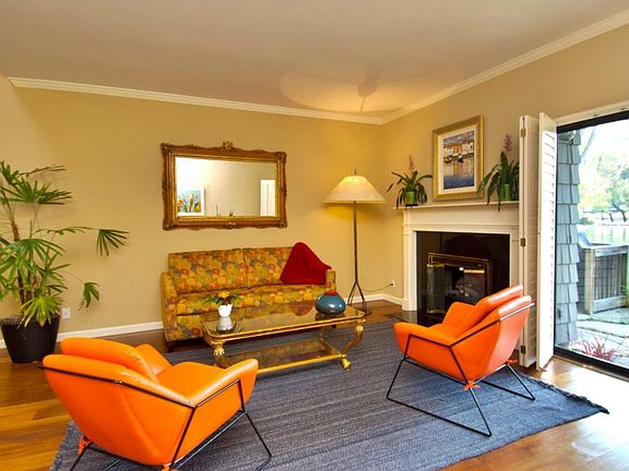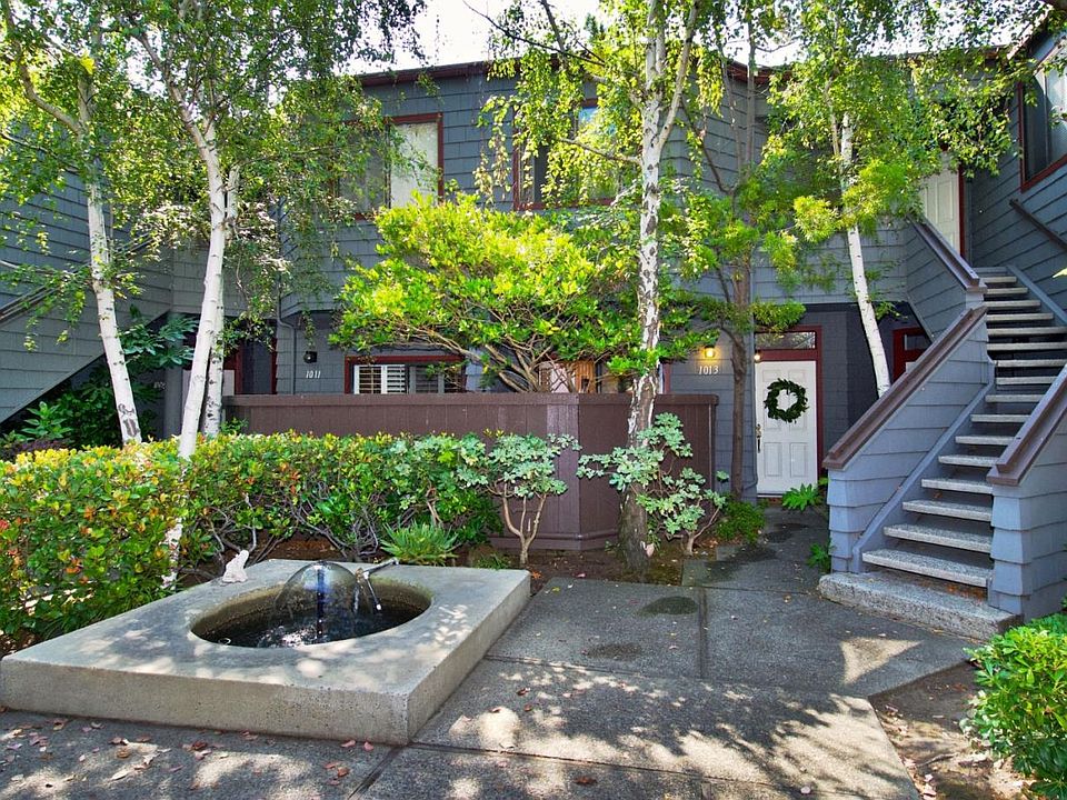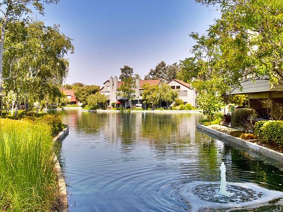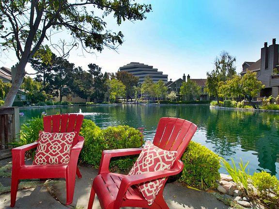 Fabulous Townhouse - sharp, spacious, serene with wide water view. Move-in ready with beautiful wood floors, updated kitchen and bathrooms. Front private patio plus back patio for lagoon views. One car enclosed garage with extra storage. 2 bedrooms and loft with vaulted ceilings. Extra storage in masterbedroom walk-in closet. Complex has great amenities including pools, spa, tennis courts, community garden! Located close to Bridgepoint Shopping Center and more! Must see!!