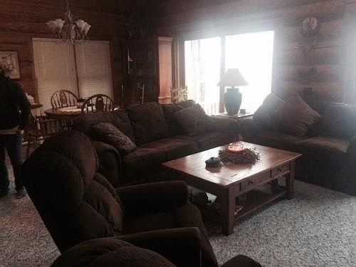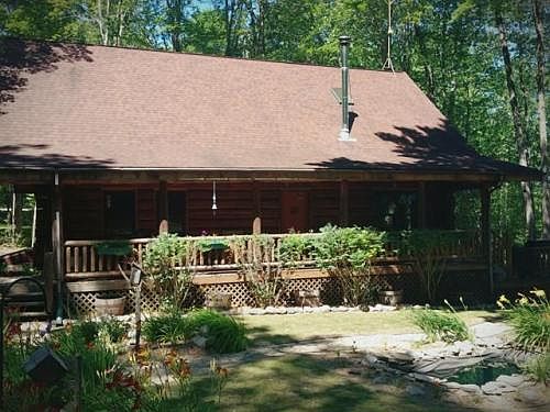 Gorgeous waterfront log home!! This 3 bedroom, 2 bath home is located on Round Lake with 80' of frontage. Featuring a large covered porch with ramped entrance, large deck overlooking the lake, beautiful landscaping, covered wood storage area, and a 2 car detached garage. Relax with a little fishing, or go canoeing and kayaking for some fun. The private dock and sandy beach area complete the package. Inside this beautiful home features an open floor plan with cathedral ceilings, beautiful views from every window. Call today to see this lovely home!