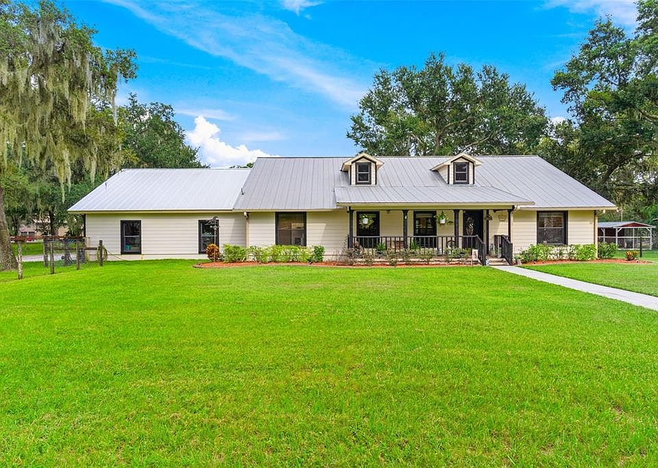 Welcome Home! This beautiful updated 5 acre Equestrian Estate is nestled in the shady hammocks of Lithia offering a private peaceful lifestyle with city convenience just minutes away. Drive up the gorgeous tree lined private country road to this Turnkey Ranchette ready for you, and your horses. Horses not your thing? Easily convert this property to suit any lifestyle you choose, entertaining, small venue, show animals, both barns have multi use capability with little to no effort. The inviting home offers 4 bedrooms, 2 baths, 3 car garage, freshly painted exterior and interior, lifetime metal roof, newer AC (2020) and a screened in saltwater pool. Step inside to a warm, spacious open concept living area offering a free flowing layout with 12 ft. vaulted ceilings and views of the beautiful grounds from every window. The remodeled kitchen features solid wood cabinetry, granite counters, stainless appliances and a breakfast nook with views of the pool. Kitchen cabinets have been professionally painted to brighten and modernize the space after photos were taken. Walk out the french doors in the great room to the the screened back porch and beautiful pool area. The saltwater pool (new pump 2023) with beautiful pebble teach finish has a waterfall and splash pad with fountain, an outside shower and stone gas fire pit. This beautiful patio pavers were just sealed in 2023, this is the perfect setting for relaxing and entertaining year round. Just beyond the pool stroll down the pavered walkway to the two barns (32x60 and 48x60). One barn is primarily used for horses and farm equipment, the second barn is an entertainment barn for parties, events or watching the game or can convert back to horse use easily. Both barns have lights, rubber mats, fans, water in stalls, wide concrete aisles. The horse barn also includes a wash rack,, feed room, and a beautiful custom air conditioned climate controlled tack room. A generator connection to run the house is located in the entertainment barn. Owners Recently added a pole barn for your RV, horse trailer or boat with 30 amp plug in and and RV drain station. The free range chickens are friendly pets and provide plenty of eggs year round. Watch the deer come in to graze from your backyard. Fenced grass paddocks for turnout, water runs along center fence for easy paddock irrigation. A Lighted Riding arena 200x300 apx suits any riding discipline of your choice with room to increase depth. Ride your horse or walk down the beautiful private road to the shaded horse trails just across the street offering hundreds of acres for riding hiking canoeing, or kayaking. Several additional parks within minutes for riding, biking, hiking, camping, canoeing. This Modern Farmhouse offers endless opportunities, Perfect venue setting for small events, excellent boarding income opportunity with room to park trailers, excellent for a riding lesson and onsite training facility , previously used as a breeding facility with stalls that convert to double stalls. By appointment only please no drive byes on the private road. Schedule your showing today, this one wont last long. Listing Agent is owner.