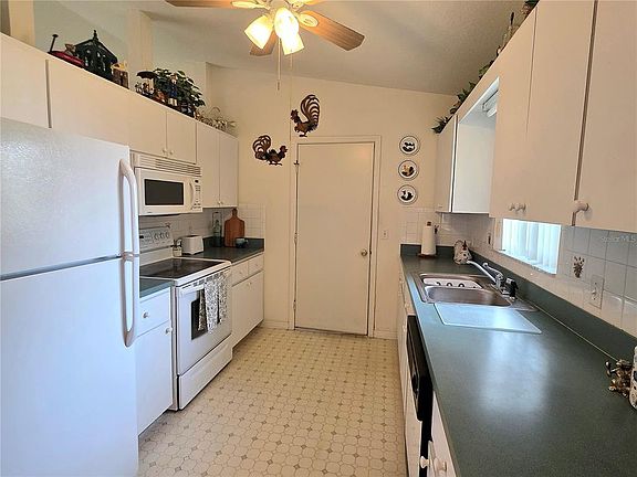 This charming 2 bedroom, 2 bathroom home is nestled in Cherrywood Estates, a vibrant 55+ community. The open-concept floor plan seamlessly integrates the living, dining, and kitchen areas, creating the perfect space for both entertainment and relaxation. As you enter this home, you will notice the cathedral ceiling in the large living room and dining area. The kitchen is light and bright and the dining area is more than ample for a table seating 6 and a hutch. The master bedroom boasts its own on-suite bath with a glass enclosed step in shower. The second bedroom is big enough for a queen bed ensemble for your visiting guests or make this room a den or flex space. The 10 x 15 enclosed lanai offers an ideal oasis bringing the outdoor in with the backyard view. It beckons you to come outside and enjoy the Florida sunshine and backyard. The BIG 2 car garage that has the laundry area with stainless steel laundry tub. The roof was replaced in 2017, A/C in 2011 and the water heater in 2024. There is an irrigation system so you can choose to add lovely gardens if you desire. HOA dues are $325/month and include trash pickup, Spectrum cable and internet, and full access to community amenities that include a Clubhouse, pool, library, tennis courts, a billiards room, card room, fitness center, shuffleboard court, horseshoe pit and planned social events. Conveniently located near shopping, dining, and medical facilities, this home offers comfort, low-maintenance living, and an active lifestyle. This area is conveniently located to a brand new shopping plaza that includes a new Publix. Located just minutes from Hwy 200 and I-75, this property offers easy access to local amenities and major highways. Many restaurants, malls, hospitals and parks are close by. You will love calling this HOME!