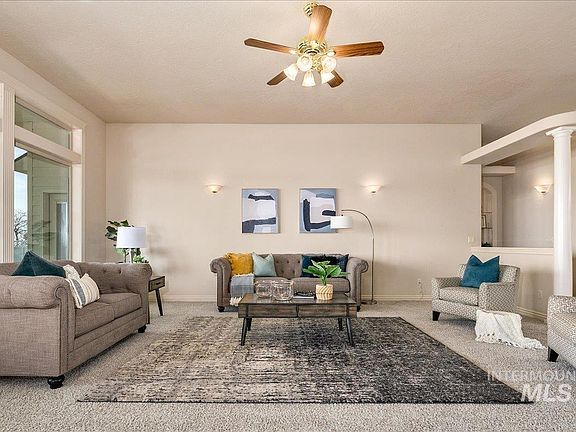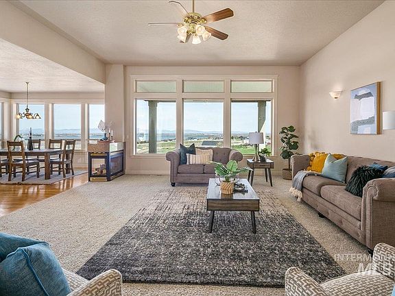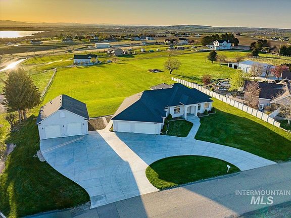 Spectacular VIEW of Lake Lowell & the Boise Foothills. Single level home with approximately 3,100 sq ft. - 4 bedrooms, 3 baths & 3-car garage on a 2.5 acre lot. 4th bedroom could be den/office. Split bedroom design with spacious living area, 10ft ceilings and corner fireplace. Kitchen features include: hardwood flooring, granite tile counter tops, induction glass top range, custom oak cabinets, built-in desk, and pantry. Private owner's suite with fireplace and sitting area. Owner's bathroom: tiled shower, jetted tub, and dual vanities. Nice utility room with cabinets, folding table, and sink. FULL SERVICE 32' x 34' detached SHOP: 10ft doors with 12ft ceilings, heat, water and shower. Circular driveway, Hardy Board siding, central-vac, newer 2-year-old Trane furnace, covered patio, east-facing backyard, community wells for both potable and irrigation.