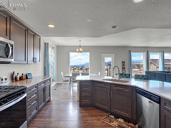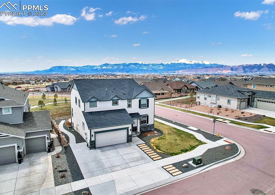 Classic's Most Popular 2 Story the Monarch with City, Pikes Peak, and Front Range Views! Open Floor Concept is sure to please! Kitchen has Quartz Countertops, 42" Soft Close Cabinets with Crown Moulding, Walk-In Pantry, Counter Bar, and Stainless Steel Appliances. Huge Living Room has Wide Open Views of Open Space and Mountains along with Gas Fireplace. Formal Dining Room and Eat-In Nook provides plenty of seating for Big Family Gatherings. Large Office on Main will be a valued space. Master Bedroom has Coffered Ceilings, Ceiling Fan, and a 14 x 11 Sitting Room that could be converted to a 7th Bedroom. Master Bathroom has Quartz Countertops, Plank Tile Flooring, Walk-In Shower, and a Walk-in Closet with Plenty of Room. Upper Level has 3 Additional Large Bedrooms. Upper Level Laundry has Cabinets and a Window for Natural Light. Family Room has plenty of space to provide for various living Arrangements along with 2 Additional Bedrooms and a Full Bath. 16 x 10 Composite Deck to View the Front Range and City Views or for Family Gatherings. High Efficiency Furnace to help save on utilities and house is prewired for A/C.