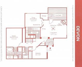 The Devon is a 1,150 square foot apartment, with two bedrooms and two bathrooms. The Devon offers a spacious living room with a gas log fireplace and a private patio/balcony. This living area is separated from the dining area with stylish French doors. The dining area features a functioning breakfast bar and large windows for natural light. My favorite part of this apartment is the master bedroom which has plenty of space including a wall to wall closet, a master bathroom with a garden tub, a separate walk in shower and a sit down vanity, this gives a new meaning too "master bedroom"!!