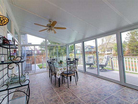 This is the perfect ranch-style home you’ve been waiting for—complete with a 3-car garage, south-facing orientation, located on a cul-de-sac, backing to a greenbelt, and just steps from Redstone Elementary School. The home features 1,814 sq ft on the main level, 10’ ceilings, wood floors, new interior paint, a large sunroom, and a spacious unfinished basement. The sunny entryway welcomes you into a flexible layout: to the right, a space that can serve as an office, living, or dining room; to the left, a sitting area, guest room, or office with French doors. The heart of the home is the large open great room with plantation shutters, a gas fireplace with blower, built-in niches, and custom cabinets with granite countertops designed to fit a large entertainment center. The adjoining kitchen includes granite countertops, a double-sized island with extra cabinets, newer appliances and sink, and a built-in desk. The extra-large primary bedroom overlooks the backyard and features a ceiling fan and vaulted feel with those 10’ ceilings. The primary bath includes a beautiful curb-less walk-in shower, double sinks, a walk-in closet, and separate water closet. Also on the main level is a second bedroom, full bath, and main floor laundry. The huge basement offers a finished ¾ bath, with the rest ready for future customization. Two basement window wells have been replaced, with new liners on the others. The home includes a new furnace, central air, and 50-gallon hot water heater. The dream garage is finished with coated floors, freshly painted walls, two garage door openers, side exit door, and attic access via drop stair. The sunroom, full of windows, has tile flooring and a ceiling fan, and opens to a deck that wraps around the sunroom. The beautifully xeriscape yard includes artificial grass, three mature evergreens, a modified sprinkler system, and new concrete pathways. A backyard gate provides direct access to the greenbelt and Highlands Ranch trail system.