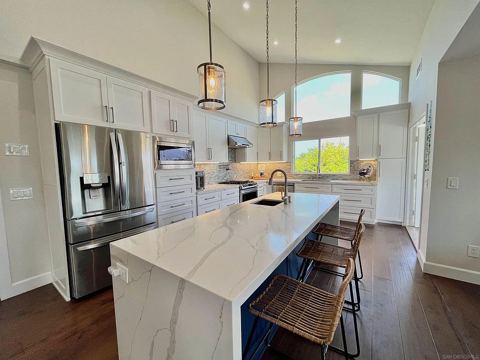Welcome to a true masterpiece nestled in the heart of La Mesa/Mount Helix. This immaculate home brought to you by its original owner, showcases high end remodeling and boasts captivating features that will leave you in awe. THIS HOUSE COMES WITH PAID SOLAR SYSTEM. Magnificent Chef's kitchen with cath ceiling, captivating waterfall island and abundance of custom cabinets and drawers. With 5 bedrooms, 3.5 baths, and an impressive 2,954 sqft, this home offers both opulence and functionality on a sprawling 17,135 sqft lot with spectacular views and a pool. Nestled on the property, is an attached guest house, ideal for multi-generational living or hosting guests. This versatile space can also be used as a granny flat, an ADU, offering additional income. Savor the breathtaking sunsets and city lights from your private wrap around TREX DECK, this spacious outdoor sanctuary is extension of your living space with french doors access from both the living room and kitchen. Experience the ultimate in relaxation and luxury with your very own resort style pebble rock salt water pool, with its own solar heating system and brand new artificial turf. Perched on an elevated lot, this La Mesa Gem offers breathtaking views of the scenic Mount Helix landscape. From sunrise to sunset, immerse yourself in a world of tranquility and natural beauty that is sure to captivate your soul. Indulge in a peaceful ambiance that only comes with a location as unique as this.