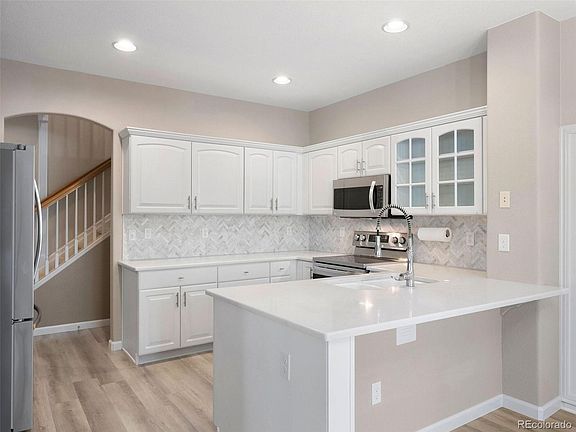 Perfectly updated and maintained making this home move-in ready! An ideal low-maintenance lifestyle home that you’ve been looking for! You’ll love this home’s unique corner orientation, providing a private patio nestled within a beautifully landscaped common area with a beautiful lawn and mature trees. It is one of only four units in the neighborhood that overlooks protected undeveloped open space. The home offers magnificent mountain views and breathtaking sunsets year-round. Upon entering the home, you’ll notice the new COREtec LVP flooring and the floor-to-ceiling, sparkling white stacked stone fireplace accenting the tastefully designed TV wall in the great room. The modern kitchen features timeless white cabinets, quartz countertops, a striking Carrara marble backsplash, and brand-new, never-used, stainless-steel appliances. The generous dining area overlooks the fenced-in patio and the great room, adding to the open floor plan concept. This home offers a main floor bedroom or study in addition to three bedrooms and a laundry room upstairs. You’ll notice the attention to detail throughout the home, including new lighting, fresh paint, new carpeting, new door hardware, new windows, and a stunning makeover in the primary bathroom, all of which seamlessly blend practicality with beautiful finishes. The property offers easy access to Colorado’s outdoor lifestyle, with paved and natural-surface trails leading to local parks and the community’s 8,200-acre Backcountry Wilderness Area from your doorstep.