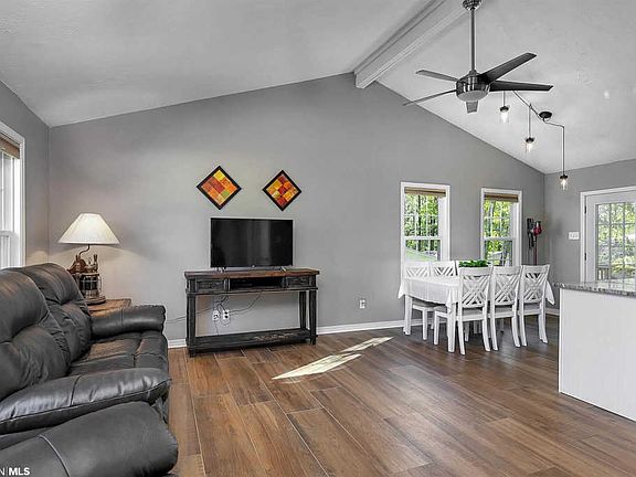 Hidden jewel â Fairhope waterfront! Well maintained 3 bedroom, 3 bath has an open floor plan with vaulted ceiling and has been remodeled with new wide plank wood look tile, stainless steel appliances, granite, white cabinets, fresh paint with an attractive color scheme. Main upper level offers outdoor entertaining on the deck featuring eating, grilling and dining space, plus a porch swing bed for relaxing! All deck furnishings including the grill convey at list price. Open concept with vaulted ceiling in living and dining (fully furnished) and kitchen with island. Two spacious bedrooms containing double closets plus two full baths. Master bedroom features private bath and his and hers closets. Ground level has a guest suite with full bath and walk-in closet and newly remodeled laundry room featuring shiplap siding plus a one car garage and three covered parking areas. Don't miss the attached list of items to convey with an acceptable offer. Roof, windows, septic tank, back deck, front steps and porch and back deck and boat dock have been replaced/added in the last 2-4 years per the sellers. Situated on a half-acre lot, the large vinyl coated black chain link fenced yard boasts a mosquito misting system, pen for pets, and outdoor entertaining on the back patio. Firepit area and screened porch with bar, furnished as shown, adjacent to the boat dock with a 3000 lb. sling boat lift, outdoor shower and sink. Minutes to Mobile Bay and 2 boat ramps nearby. Fairhope schools! Fisherman's paradise near natural beauty and Weeks Bay nature preserve.
