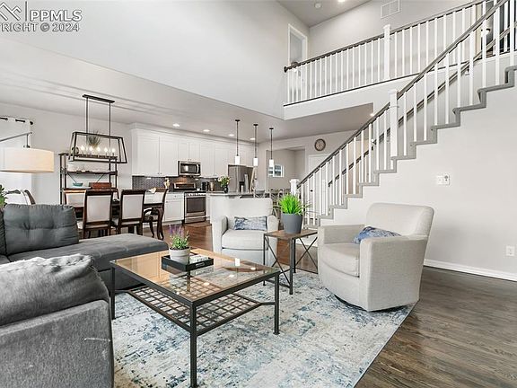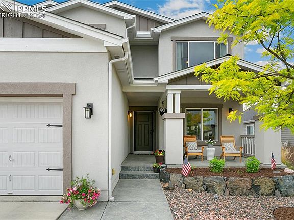 Stunning home with mountain views situated on a cul-de-sac in Cordera backing to the community walking trail and open space. This home is loaded with upgrades throughout and shows like a model. You are greeted by the inviting front porch. The dramatic 2-story great room features soaring ceilings, large windows, a fireplace and shiplap finishes. The kitchen overlooks the great room and dining nook, making this home ideal for hosting guests. The gourmet kitchen is elegantly appointed with granite counters, back splash, sprawling island and pantry. The bonus room can be used as a dining nook, school room or music room. The main level offers an office, bathroom and mud room leading to the garage. The upper-level features four bedrooms plus the laundry room. The master suite provides sweeping mountain views, a luxurious 5-pc bathroom and his & her closets. In the secondary bedrooms, there is a "secret passage" in the closet that leads to the adjoining room, and a ceiling mural of the nights sky. The bright and open walk-out basement offers 9’ ceilings, spacious family room with kitchenette, bedroom, bathroom and storage. An ideal space for multi-generational living, there is a washer and dryer in the storage room. Enjoy summer evenings on the composite deck overlooking the back yard, extended patio and open space. You will love the easy access to the extensive trail system that leads to nearby schools, parks and community center. Excellent location, just minutes from I-25 with easy access to downtown Co Springs or Denver, award-winning District 20 Schools, shopping, dining & hospitals. The Cordera Community hosts fun seasonal and summer events and concerts plus offers a community center and pool. There is nothing left to do, but move in and enjoy the amazing views, location and amenities of this home. New roof to be installed 6/17/2024.