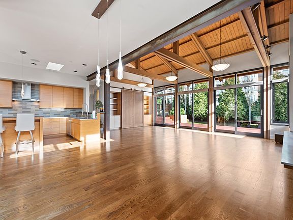 Very convenient and ultimate walkable location in downtown Bellevue Vuecrest places restaurants, shops and parks at your fingertips. A Peter Davis built contemporary and open rambler is detailed with vaulted wood ceilings, warm hardwoods, exposed wood and steel beams, and lots of light. Large glass sliding doors off of the great room open to a private patio with an outdoor fireplace, waterfall, deck and garden. Master suite with walk-in closets. 3 bedrooms, 31/2 baths, a finished four car garage with high ceilings and a lush level and private site to spread out and enjoy. - Built in 2013, rare rambler in downtown Bellevue. - 3240 sf, lot size is 0.31 acres. - Minutes away from Bellevue Transit Center. - Blocks away from Bellevue Square. - Minutes to Highway 520, 405 and I-5. - A/C, 4 Parking spaces. - Wired Sonos, security cameras throughout the house. - Bellevue school district with Medina Elementary School and Bellevue High School. - Cats, small dogs ok. Tenants pays for utilities and internet, maintenance of the yard.