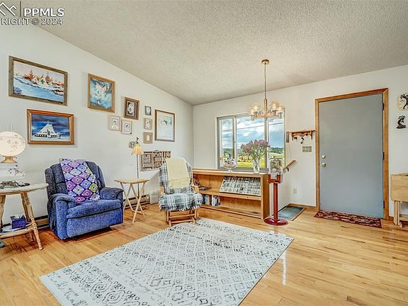 Cute rancher, with Great Room concept with spectacular views of Pikes Peak and lovely views to the north. The great room sports lovely hardwood floors, a free standing gas stove and built in bookcases. The kitchen area has ample cabinets and counter space, an eat-in dining space and a window over the sink that takes in the Pikes Peak and mountain views. The large primary bedroom has a walk in closet, plus wall closet and plush carpeting. The second bedroom is also spacious, with plush carpeting and has a lovely view of the meadows to the north. The laundry space, with an exterior door to the deck, has a window for brightness and built in ironing board. The main level 3/4 bath is on the opposite end of the hallway. The lower level has a walk out to the RV parking area, a 3/4 bath, semi-finished office/den and a large open area for storage or finish for a great recreation room. There is already a sink unit in there to make this an ultimate game or theater room. The over-sized 2 car attached garage has a workshop and it's own door to the deck. The deck has lovely views of Pikes Peak, great for relaxing and just a perfect spot for al fresco dining. The lot consists of 3 original lots, with RV parking area on the west side, two storage sheds and the back is fenced. Septic was pumped 08/05/2024. This home is being sold "As-Is".