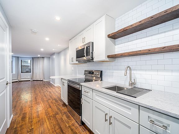 Discover this modern & spacious garden level studio in a historic brownstone on coveted uptown Hudson Street. The recently renovated interior features a highly functional floor plan with stunning modern updates. The striking white kitchen boasts gleaming quartz countertops, stainless steel appliances, ample storage with farmhouse style open shelving, a cozy breakfast bar nook, and Edison bulb pendant lighting. All appliances and fixtures are energy-efficient, promising savings on utilities. Additional highlights include a large bathroom with stand up shower & vanity with storage, recessed lighting, beautiful bay window, a California closet, and the convenience of an in-unit washer and dryer! Steps away from picturesque Elysian Park, short stroll to the waterfront, restaurants, shops, and all that Hoboken has to offer. Commuting to NYC is a breeze with the bus stop to Port Authority just around the corner. This home is a must-see, schedule your tour today! The apartment will be freshly painted, deep cleaned, with brand new blinds and (white) bathroom vanity installed prior to new tenant move in! 1 Month Broker Fee Applies. Tenant responsible for electric (no gas in the building). Owner pays cold water. Pets considered on case by case basis with pet fee/deposit. The apartment will be freshly painted, deep cleaned, with brand new blinds and (white) bathroom vanity installed prior to new tenant move in!
