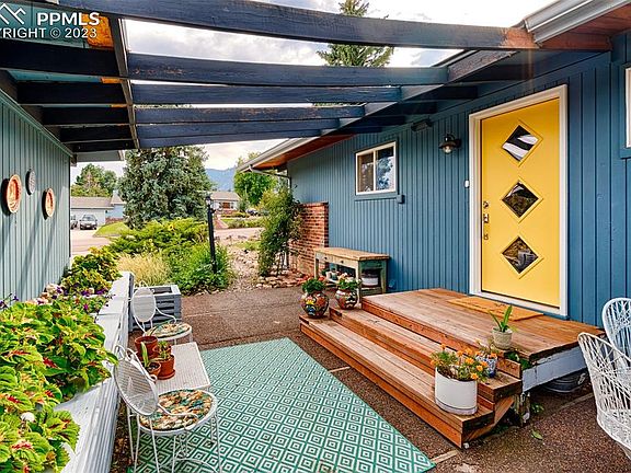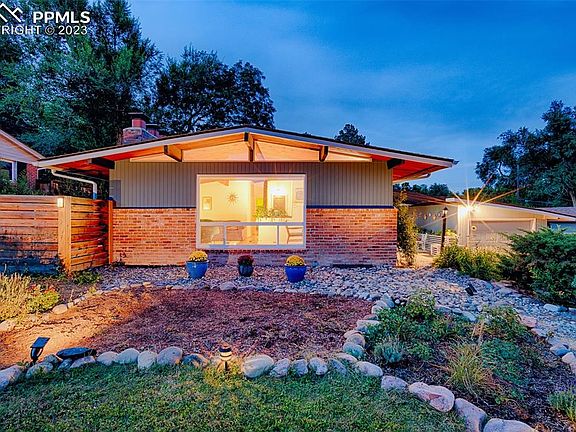 Welcome to the rare opportunity for a true piece of mid-century modern architecture in Skyway Park! This 1954 home offers the sought-after high-pitched tongue and groove ceilings that are so hard to find unaltered in Colorado Springs so you can enjoy the warm atmosphere the beautiful wood adds to the open concept living and dining area. When it starts getting cold outside, you can cozy up at the wood burning fireplace while looking at the mountains through the panorama window at the front of the home. And if one wouldn’t be enough, there is another wood burning fireplace in the basement living area and in the gorgeous brick chimney on the side patio which is ideal for entertaining and again offers mountain views. The large backyard is fully fenced in and offers multiple seating areas, garden beds, a wooden path and basketball area behind the one car detached garage. While this mid-mod stunner offers a lot of original details, it also offers 21st century comfort and updates: NEW basement flooring with high quality carpet, NEW electrical panel, NEW and up to code electrical service entrance, newer appliances (gas range!) in the charming vintage kitchen with a contemporary concrete countertop, central AC, updated bathrooms, egress window in the primary bedroom downstairs, brand new custom design front door, newer patio door and windows, newer roof! Skyway Park has no HOA or Metro District (!) and is located on the popular west side of Colorado Springs with access to trails, Bear Creek Park, The Broadmoor, The Little Dipper Pool and more!