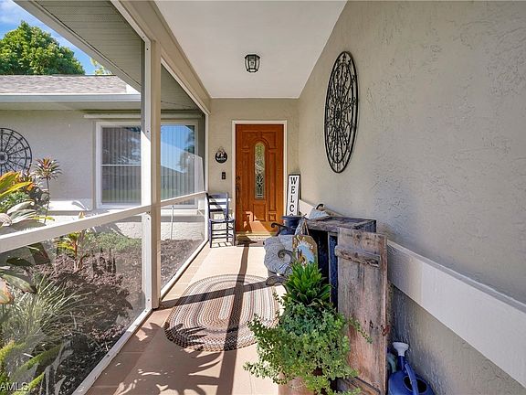 Welcome to one of the prettiest homes you'll find on today's market at this price point, one which conveys homeowner pride inside and out. Gorgeous back yard with many specimen plantings including shady pine trees & your own lime tree for making key lime pies or cocktails! Perfect for the nature lover! Plenty of room for a pool too! Enter the long enclosed entry to a welcoming front door. Open living, dining & kitchen with an island and spacious countertop overlooking the roomy enclosed, tiled lanai with a view of your very private backyard oasis. Split bedroom floorplan. King-sized primary bedroom w/walk in closet. Tile throughout except for plush carpeting in 2 Queen-sized secondary bedrooms. Brand new roof & gutters 2023 w/transferable warranty. Newer impact resistance windows. Sale may include living, dining rm furniture &/or antique guest bedrm furnishings. Centrally located & situated in a well-maintained neighborhood, in popular SW Cape Coral just minutes from shopping, restaurants, downtown, medical facilities, houses of worship, fishing, boating, marina & much more! 1 Year Home Warranty included and ALL Assessments paid in full! Everyone has sun, but we have sun and shade!