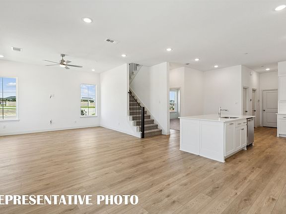 CB JENI HOMES MARTIN floor plan. 2,668 sq ft, 4 bed, 3.5 bath luxury townhome on a corner homesite featuring a huge covered front porch—perfect for a dreamy porch swing. This home boasts 10-ft ceilings on the first floor and the owner’s suite downstairs with tray ceiling finish, spacious bedroom, walk-in closet, and spa-like bathroom with oversized shower and dual sinks. Abundant windows flood the home with natural light, ideal for entertaining. Chef’s gourmet kitchen opens to the dining and family rooms and includes a large island, pantry, quartz countertops, site-finished cabinetry with hardware included, under-cabinet lighting, stainless steel appliances, pot and pan drawers, and 5-burner gas cooktop. Upstairs offers three large secondary bedrooms with walk-in closets, including one en suite, a huge game room, and a media room. Located in Twin Creeks Watters, in the heart of exemplary schools, dining, shopping, lakes, parks, and acclaimed golf courses. Enjoy low-maintenance living with modern elegance. Ready OCTOBER 2025!