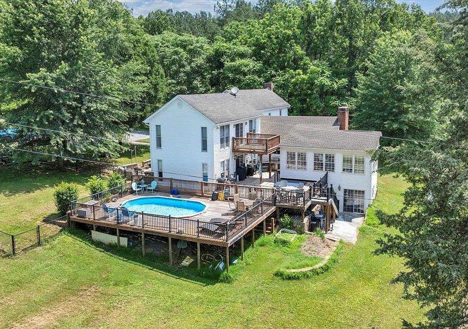 Experience Lakeside Living with this charming 3 bed, 3 bath waterfront farmhouse. Nestled on 2.69 acres and 80 feet of shoreline, this country gem will satisfy all of your family's desires. Walking through the front door you're greeted with a pleasant entryway and a large living room with deck access rounded off with a bedroom and bathroom. The spacious country kitchen features elegant quartz countertops, a cozy fireplace, and plenty of space for entertaining family and friends. Enjoy year-round beauty in the sunroom, which provides stunning views of the lake and access to your deck, complete with a swimming pool and hot tub for ultimate relaxation and lake views. Upstairs, you will find the oversized master suite serving as a peaceful retreat and offering breathtaking water views from your private balcony. A second bedroom and third bathroom complete the upstairs. The property also includes a private dock with a boat lift, making waterfront living as convenient as it is beautiful.