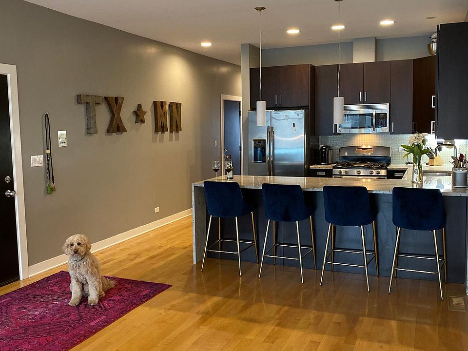 Rarely available much larger-than-your-average West Loop apartment. 2 Bedrooms, 2 Bed condo-style boutique building with only 3 units featuring modern finishes, hardwoor floors through out and lots of storage. It's truly an entertainers dream! The living room area features a working gas fireplace perfect for those chilly evenings, a TV hook-up where you can hide your wires, room for two full size sofas, coffee table, accent chairs, a bar & other furniture. The dining area is large enough for a dining table that sits 10 people and has a ceiling hookup for your own light fitting. There's a good size kitchen with stainless steel appliances, dishwasher (new in 2020), garbage disposal, lots of cupboards and a large breakfast bar with room for 4 counter stalls. A full wall of windows with double doors allows for plenty of light, especially in the autumn/winter months - your plants will thrive here! Large private outdoor balcony, fits a BBQ and easily enough seating set for 4 people or more. The primary bedroom is big enough for a king size bed and your other bedroom furniture, good size walk-in closet. A large ensuite bathroom with deep jet tub, dual sinks and a standalone shower. Plenty of storage! The bright second bedroom is large with a good size closet and easily fits a Queen bed. Very pet-friendly! In-Unit Washer Dryer. Heating & Cooling. Semi-private detached garage with dedicated space included in the rent! Located on leafy Monroe street moments to Mary Bartelme Park but only a few minutes walk to bustling Randolph Row and Fulton Market gyms, shops, restaurants and bars. You're probably wondering the catch is for the price/size/location, right? Well it's a 3rd Floor Walk-Up, about 42 steps! The Deal! You would be taking over our lease directly with the management company. There will be a $575 fee to change over the apartment (paint touch-ups, full-clean etc)