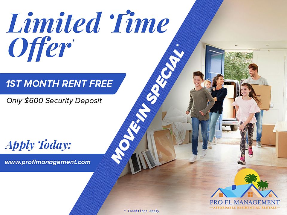 Please note we also accept Section 8 and HUD VASH vouchers Have questions go to the Pro FL Management website. Please contact us through our website questions and to submit an application $600 security deposit, a one time $50 move in administration fee and a $50 lease signing fee. We do allow pets; there is a $20/month per pet rent and a $99 per pet one time non-refundable pet deposit, only 2 pets per home. NO DANGEROUS BREED ANIMALS Apply directly on the Pro FL Management website. The application fee is $25 per adult. All applications are transferable to any available properties. Also check out our FAQ tab on our website, that can answer most questions regarding the application process and qualifications necessary. BONUS: Have peace of mind in knowing this property is professionally managed by Professional Florida Property Management. With a fully staffed tenant support hotline, all of your requests will be addressed immediately and all maintenance repairs are performed by professionals. Rent can be paid in cash, credit or debit online through our portal system, or by e-check. BE AWARE: Scams are operating in this region. Pro FL Management Inc will never advertise on Craigslist or Facebook, ask you to wire money, or ask you to keep the key to the home for move in.