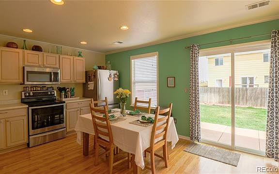 Clean, bright and an open layout will bring you into this home. The 3 large bedrooms, abundant light and quiet neighborhood are some key features that will make you want to purchase this home. Inside the home is a huge living area with attached kitchen. The kitchen has been outfitted with new Stainless Steel Appliances, cabinet pull outs for the best use of space and has room for a large table. Upstairs you will find three large bedrooms and two bathrooms. The master bedroom offers a huge walk-in closet and it's own private bath. The back yard is accessed through a sliding glass door off of the kitchen. The yard has a beautiful mature tree, dog run and sides to open space and the Thornton Sports Complex. The home is conveniently located minutes away from I-76 and I-25. The well maintained common grounds area offers a playground, large field, and a gazebo.