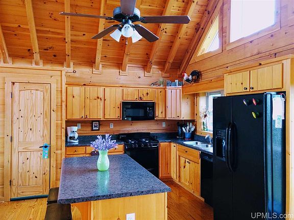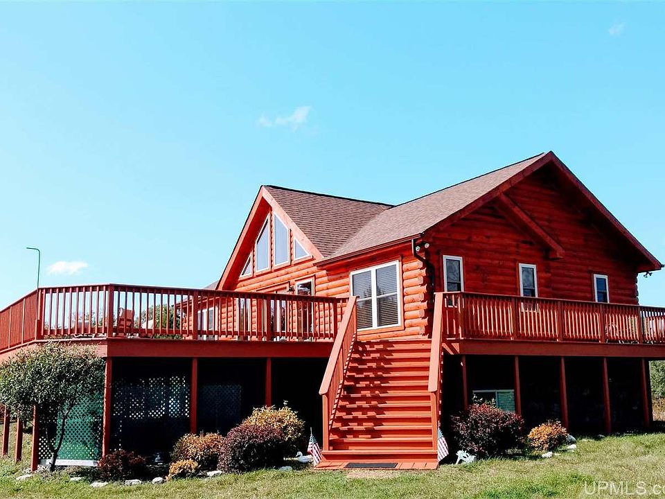 This is a fully off grid Lodge, built in 2011 and sits on 244 beautiful acres of wooded property in Michigan's Upper Peninsula, nestled in the heart of the Hiawatha National Forest in Delta Co. This fully furnished Lodge is perfectly suited for a full family residence or as a secluded hunting resort. This spacious 2,335+ sq ft open concept floor plan features 4 bedrooms, 3 full bathrooms and provides all the amenities of home. Some features include all wood cathedral ceilings on main level in kitchen and living room with windows looking out over a large deck that expands the length of the home, providing breathtaking panoramic views of the property. The main floor features T&G white pine walls and yellow pine wood floors throughout. Kitchen has a spacious island, large pantry, appliances and plenty of storage space. The main floor includes 2 bedrooms and 2 bathrooms, with a master suite that features a separate shower and jetted corner tub with double vanity sinks. The walkout basement features 2 additional spacious bedrooms, family room, large mud room with laundry and another full bathroom. There is also a propane fireplace. This home is fully off grid with electricity being supplied by a solar and battery system and includes a backup generator that is maintenance free with gel batteries, auto start and a 7 yr warranty. It is a fully functional for year round living and served as the primary residence for a family of 5 when first built. There is a well and septic and in addition to the main building there is a 50x84 pole building with (2) 18' garage doors on both ends, perfect for storing a motor home, camper, boat(s), ATV's and any other outdoor accessories. PLUS there is a 500 sq. ft fully furnished hunting cabin that overlooks a large pond. The main floor of the cabin features solid wood cedar flooring, freestanding wood stove and an upper loft area. The vast majority of land is high ground mixed with a combination of white pine, cedar, popple and maple trees with two small creeks running through the property with deer blinds included. This is excellent deer hunting property. Schedule your private showing today.