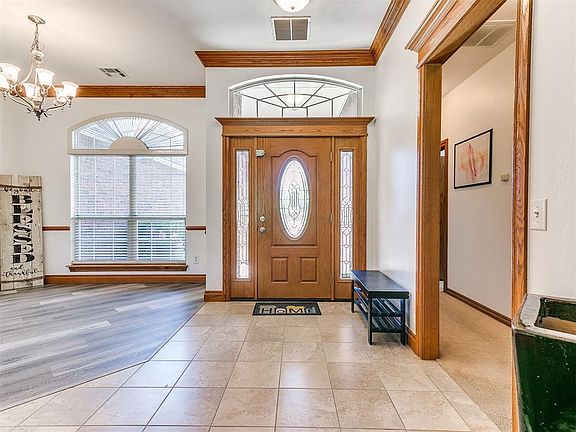 Welcome to this 1-acre beautifully maintained, spacious home situated on a full acre in the sought-after Ridgefield addition, just minutes from shopping, dining, and Tinker AFB. Located in the award-winning Carl Albert School District, this home blends comfort, functionality, and style. All on one level—except for an upstairs bonus/theater room—this home offers 4 generously sized bedrooms in a desirable split floor plan. Enjoy the convenience of two primary suites, with the main suite featuring a private study or nursery, spa-style bath with separate tub and shower, dual vanities, and a large walk-in closet. Entertain with ease in two living areas and two dining spaces, plus a chef’s kitchen complete with a breakfast bar, built-in stainless steel appliances (including a built-in air fryer oven) custom pull-out drawer under cabinets.Two additional bedrooms on the opposite wing feature walk-in closets and share a stylish Jack-and-Jill bathroom. A spacious utility room includes a sink and two closets for extra storage. Private well means NO water bill! Storage is abundant throughout the entire home. Upstairs, retreat to the theater room—perfect for movie nights or game days.The new oversized modern 3-car side-load garage includes custom storage shelving and an in-ground storm shelter. Enjoy added features like a circle driveway, newer gutters, wrought iron fencing with extended concrete, sprinkler system, new backyard shed, and three flag poles.The expansive yard is pool-ready—a perfect canvas for your dream outdoor entertaining space.This property offers an incredible opportunity for luxury living with space to grow. Schedule your private showing today!