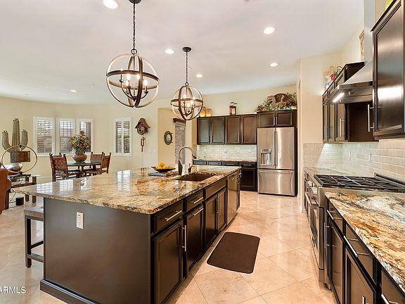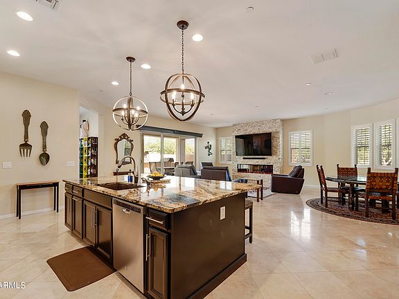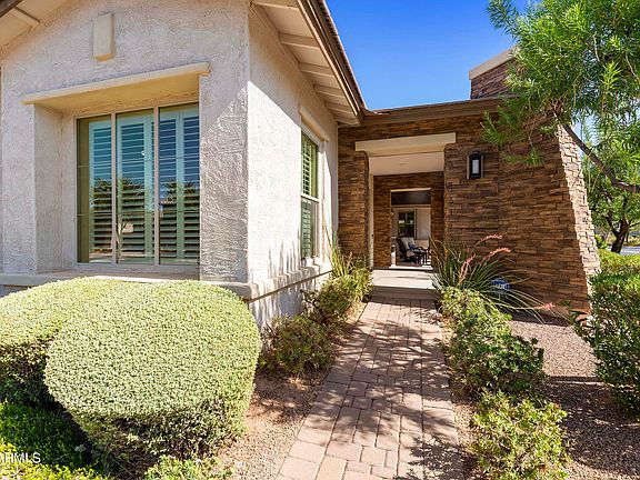 Entertainer's delight inside & out. Situated on a corner lot & backs a walking path. This concert plan is nicely appointed & boasts 3,194 sq ft of livable space & 2.25-car garage (room for a golf cart). Includes 2 oversized ensuites, W-I closets-custom organizers, raised vanities with granite counters. Home offers dining/flex rm, den, spacious great rm with stacked stone fireplace & multi-slider with remote shades opening to an expanded travertine paver patio with extended B-I bbq island + gas fire-pit. The gourmet kitchen offers an abundance of cabinetry, lg dbl-sided island with Magma Gold granite counters, SS appliances including dual fuel Fulgor range, wall mounted hood & lg W-I pantry. 2nd multi-slider with remote shades opens to pergola covered travertine courtyard. With many extras Encore, an award-winning 55+, offers clubhouse, Bocci ball, pickle ball, tennis, heated pool (with lanes) & spa. Also work-out facility, craft room, billiards, Proving Ground Cafe, meeting rooms, card rooms and a number of planned activities and groups to join.