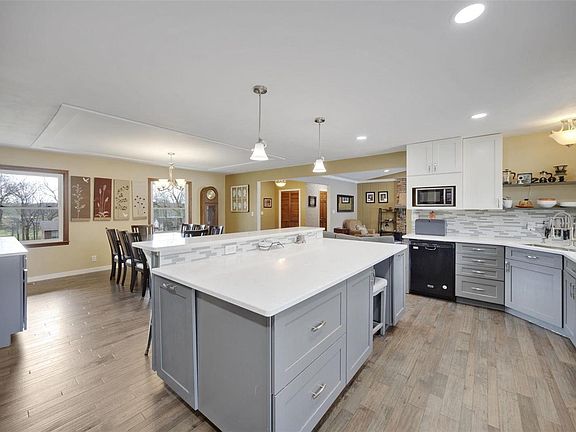 - Open Floorplan, Vaulted Ceiling(s), Dining/Living Room Combo, Kitchen/Dining Room Combo, Breakfast Bar, Kitchen Island, Custom Cabinetry, Eat-in Kitchen, Solid Surface Countertop(s), Workshop/Hobby Area