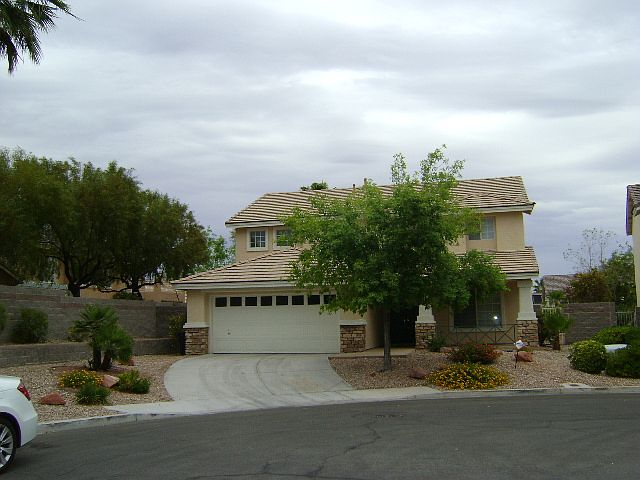 Fantastic Summerlin Neighborhood. This home sits at the end of a cul de sac. Step inside to find soaring ceilings and a gracious staircase. Formal living and dining room. Large eat in kitchen with plenty of cabinet and counter space. Stainless steel appliances, microwave, all upgraded appliances. Kitchen overlooks large family room with double height ceiling & fireplace. Nice tile floors downstairs for easy care. Full bath and bedroom downstairs. Master is separate over the catwalk. Very generous Master with its own balcony overlooking the back yard. Master bath with walk in closet, dual sinks, separate tub & shower. Home has a total of 5 bedrooms. Out in the back yard it is a paradise. Nice covered patio, grass, fountain and nicely landscaped large yard. Neutral colors through out and all window coverings. Alarm. Ample garage space. Home shows very well and priced right. It is time to make this wonderful home yours!
