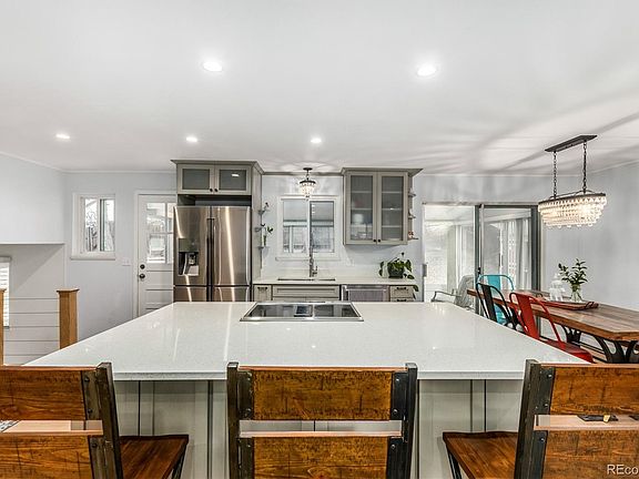 Welcome home to your peaceful oasis in Sun Valley Estates! As you enter, you are greeted by an open floor plan, complimented by an abundance of natural light, wood floors, designer paints, and chic fixtures, creating a sophisticated ambiance. The kitchen is the epitome of modern comfort and style. Boasting sleek stainless steel appliances, quartz countertops, gray shaker cabinetry, recessed lighting, and a large island with a breakfast bar. The culinary space is a cook's delight. The lower level features a cozy family room with updated fireplace, making it ideal spot to kick your feet up and relax with loved ones on those cool Colorado evenings. As you venture upstairs, you'll discover three bedrooms, including the primary, which stands out with a private bathroom. But the allure of this home extends beyond its interior! A delightful sunroom provides a cozy space to unwind and soak in the natural surroundings. Outside, a tranquil backyard awaits! This large, well-maintained yard provides a quiet and peaceful space to enjoy nature while relaxing on your shaded deck or enjoying a meal on your outdoor patio. Backing directly to East Reservoir open space, the lot not only provides and undisturbed space, but also gives easy access to miles of trails and an abundance of open space. PLUS, a storage shed offers ample space for all your outdoor equipment, while a chicken coop adds a touch of rural charm to the property. With easy access to trails, lakes, parks, Belmar shops and restaurants, and just minutes from 6th Ave, the location can’t be beat. Whether you're looking to relax indoors, or take a leisurely stroll along the reservoir's edge, this property is a gateway to the serene beauty of the outdoors, all while providing a refined and stylish living experience. Don’t miss out on this hidden gem!
