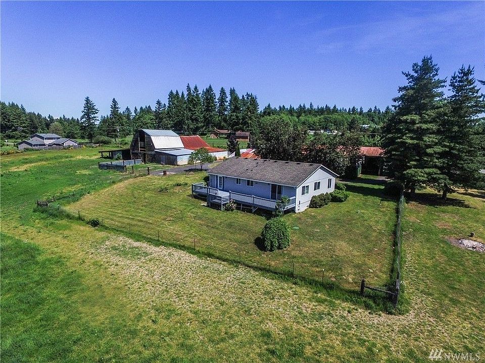 Lovely rambler on acreage. 3br 2ba with new carpet and paint inside. 5.46 acres with large barn and shop totaling about 12,000 SF. There was previously a permitted ADU (mobile) on the property, now removed but separate power hookup, water and septic hookups remain for ADU. 5 bedroom septic with room to expand on the house. Large deck overlooks pasture and trees. Partly fenced, buildings are serviceable. Loafing sheds for horses or other animals. Perfect for equipment and or animals.