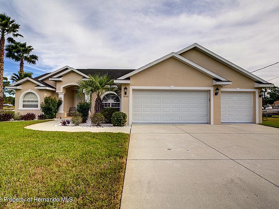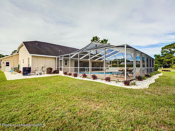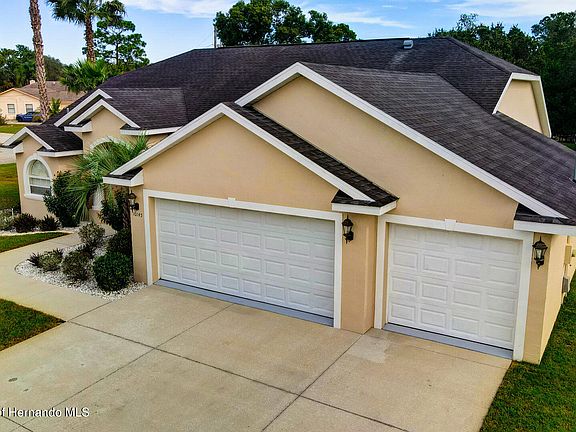 This beautiful Contemporary style home is located on an oversized corner lot amongst other custom-built homes surrounded by the Oak Hills Golf Course. The lanai, pool enclosure and patio area are expansive and ideal for entertaining. The oversized garage has three bay doors and a rear service door that opens out to a wide concrete walkway that leads directly to the pool. The landscaping surrounding the pool is complimented by concrete curb-a-lawn edging which will keep the rocks in and the grass out. The oversized lanai can be accessed from the living room, master bedroom and from a 3rd full bathroom that is also accessible from inside of the home. If the temperature outside is low but your spirits are high and you would like to go for a swim, no problem, as the pool is equipped with an electric heater. As you come through the double door entry you will be immediately impressed by the open and airy floor plan. The interior ceiling height peaks at just over 13 feet and is complemented by fenestration which includes transom glass archways along the entire front elevation. The open floor plan has a large living room / dining room combination. The kitchen features a breakfast bar and a separate breakfast nook overlooking the pool area. There is plenty of cabinet space as the kitchen cabinets are up to 42 inches along the interior wall. The laundry room is located directly off of the kitchen and leads out into the oversized 3 car garage. All of the bedrooms are ample in size and feature an abundance of storage. One guest bedroom features a double closet that runs the full width of the room, while the other guest bedroom features a 9'6' x 3'11' walk-in closet. The master bedroom features two walk-in closets and an ensuite bathroom with a stall shower with a separate garden tub. The kitchen, breakfast nook and bathrooms offer ceramic tile flooring. The master bedroom, guest bedrooms and living room / dining room combination offer a durable wood laminate flooring. Other amenities include an attic drop stair, slop sink in the garage, sprinkler system, decorative soffit shelving, decorative archways, recessed can lights, bullnose drywall corners, pocket door(s), closed circuit camera system, and a large pantry / closet in the laundry room. This well-appointed and meticulously maintained home is a must see and is sure to please the fussiest of buyers. Scheduled your preview today!