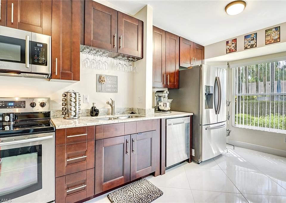 Breathtaking is the word that best describes this listing. You will be captivated upon visiting this immaculate and charming piece of paradise. It has it all. Let's start by saying that this property has been completely remodeled within the past year. Impeccable open kitchen with stainless steel appliances including a wine cooler, built in pantry and wood cabinets with beautiful matching granite, Spanish porcelain tile floors all through out. Both bedrooms have walking closets. Master bathroom has a dual sink vanity and a shower while the guest bath features a fully functional jetted tub. But this is not all!. This unit happens to be located just a few steps from the swimming pool. It will feel like having your own private pool. Manual shutters are installed on all windows and doors and are maintained by the association. Property also comes with a covered parking space and a storage unit in front of it. Regent Park is a non gated community located right off Immokalee Rd, perfect location in the middle of town, close to beaches, major shops and restaurants, NCH hospital and a 5 minute drive from I-75. Come see it for yourself. You won't be disappointed.