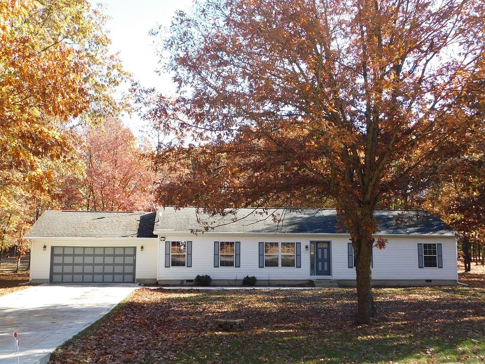 Modern, spacious and clean! You'll love the layout of this home. This open concept, ranch style abode has large rooms for gathering and a split bedroom floor plan. Plenty of room for hosting with a living room, dining room and den. All bedrooms have their own walk-in closets, and the primary suite has its own private bath. Recent updates include 6 panel wood doors, ceiling trim, kitchen countertops, concrete driveway, leaf guard gutters, laundry room cabinets, and even a built-in workbench. (House is completely drywalled). All major appliances stay including washer and dryer. Absolutely beautiful, wooded, 1 ACRE LOT. Brand new shed. Schedule a showing today.