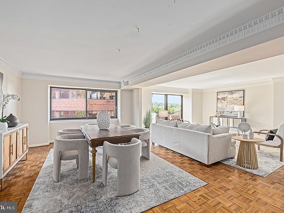 Welcome to Unit 507 at The Flour Mill, a stunning condominium in historic Georgetown, nestled between the old C&O Canal and the Potomac River. This part of Georgetown is truly unique, offering the best of both worlds - the vibrant energy of M Street is just a short walk away via a charming footbridge, while the canal provides a tranquil buffer, perfect for scenic walks along the water. The Flour Mill has a welcoming lobby with a staffed front desk and guaranteed parking, with direct access to the resident’s floor, for a nominal monthly fee, This unit has an expansive layout, wide hallways, and large, light-filled rooms. Step into the generous entry hall, with a double coat closet and a beautifully appointed powder room with granite countertops and abundant cabinetry. The butler’s pantry features extra cabinetry and pink granite countertops, leading into the large square kitchen. A chef’s dream, this kitchen is equipped with stainless appliances including a Sub-Zero side-by-side refrigerator, KitchenAid dishwasher, a Uline wine fridge, and a built-in Maytag microwave and matching range. Matching pink granite countertops, combined with extensive storage - including pull-out shelving in the cabinets - ensure both style and function. A bar counter opens into the dining room, and has seating for two for casual meals.