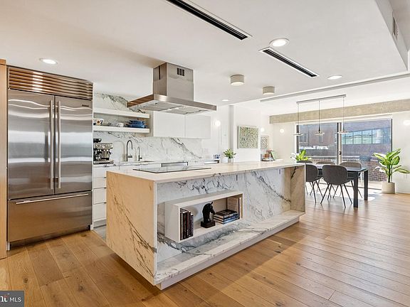 Meticulously renovated, this unique top-floor residence at the Flour Mill embodies a sophisticated, modern design. The duplex's open layout is accentuated by exposed concrete columns, custom features, and elegant marble surfaces throughout. It boasts hardwood floors, a sleek kitchen with designer-grade finishes, spa-like bathrooms, a wood-burning fireplace, ample closet space, and two private balconies offering views of the Potomac River and Rosslyn skyline. Located at 1015 33rd Street NW, the building offers a front desk, additional storage, and guaranteed on-site rental parking. The Georgetown Waterfront Park and the vibrant shopping and dining of M Street are just a short stroll away. The neighboring Flour Mill office buildings, particularly the one at 1000 Potomac Street NW, are being transformed into a 135-unit residential development featuring 8,000 square feet of retail space, as announced by the developers. This project involves replacing the façade of the South building and redesigning the landscape of the inner plaza. It also includes a new 450-square-foot residential lobby and a penthouse dedicated to residential amenities.